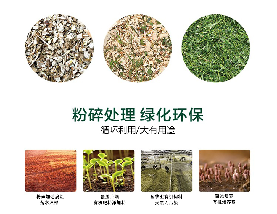 碎物用途:覆蓋裸露土壤,防止揚塵;抑制雜草生長,保濕土壤;漚肥或自然腐熟改良土質(zhì),良好的有機肥盆栽土壤;食草類動物飼料,食用菌栽培基料;紙漿和人造板材原料;生物燃料等。