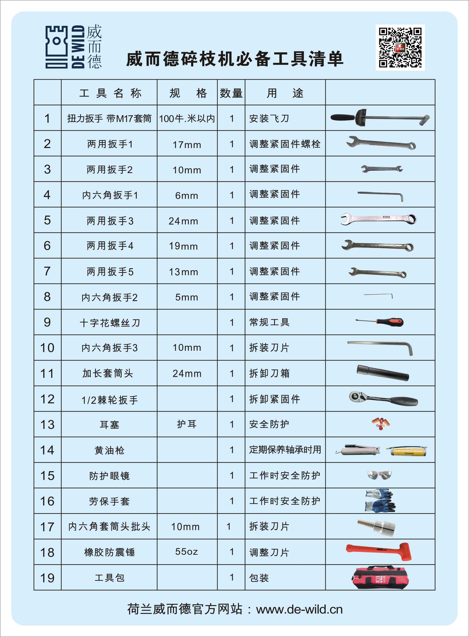 為了給用戶更好的使用體驗,威而德碎枝機(jī)配有專用工具包。經(jīng)過培訓(xùn)后,用戶可輕松完成更換刀片、維護(hù)保養(yǎng)等日常工作。