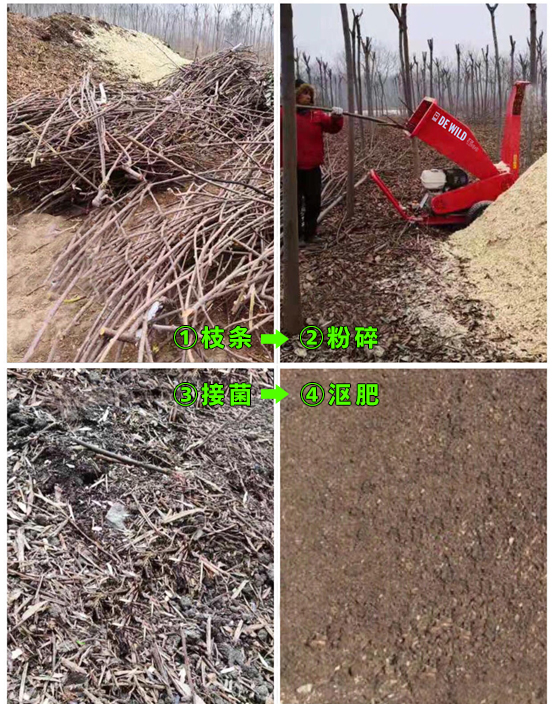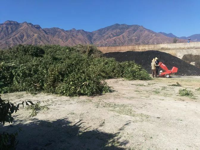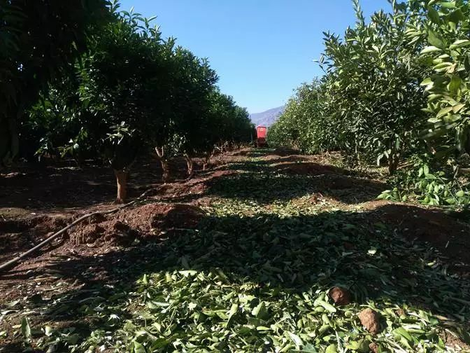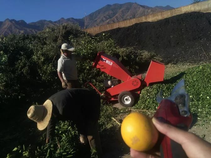 最初該基地修剪下的橙樹枝條都是讓農(nóng)戶各自帶回家當(dāng)柴火使用。隨著環(huán)保的要求逐漸增高和機械化作業(yè)的實施,自2017年底起,該基地修剪后的枝條將首先由碎枝機粉碎,粉碎物直接覆蓋還田或經(jīng)發(fā)酵后制成有機肥的方法,來實現(xiàn)有機廢棄物的再利用。