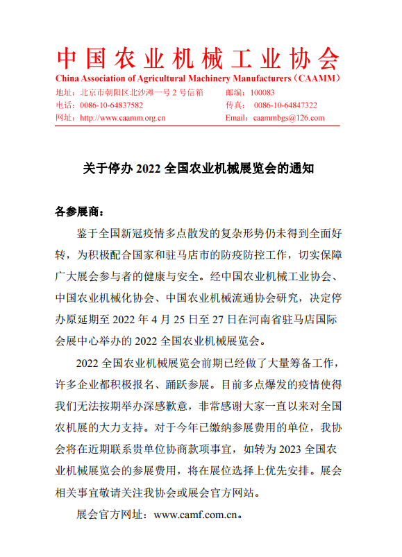 【農(nóng)機網(wǎng) 會展快訊】鑒于全國疫情多點散發(fā)的復雜形勢仍未得到全面好轉(zhuǎn),為積極配合國家和駐馬店市的防疫防控工作,切實保障廣大展會參與者的健康與安全。經(jīng)中國農(nóng)業(yè)機械工業(yè)協(xié)會、中國農(nóng)業(yè)機械化協(xié)會、中國農(nóng)業(yè)機械流通協(xié)會研究,決定停辦原延期至2022 年 4 月 25 日至 27 日在河南省駐馬店國際會展中心舉辦的 2022 全國農(nóng)業(yè)機械展覽會。