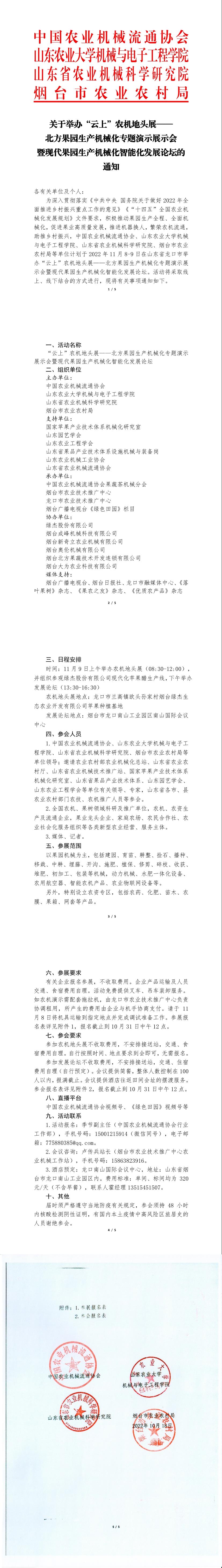 為深入貫徹落實(shí)《中共中央 國務(wù)院關(guān)于做好2022年全面推進(jìn)鄉(xiāng)村振興重點(diǎn)工作的意見》《“十四五”全國農(nóng)業(yè)機(jī)械化發(fā)展規(guī)劃》文件要求,積極推動果園生產(chǎn)全程、全面機(jī)械化,促進(jìn)果業(yè)高質(zhì)量發(fā)展,推進(jìn)機(jī)器換人,繁榮農(nóng)機(jī)流通,助推鄉(xiāng)村振興,中國農(nóng)業(yè)機(jī)械流通協(xié)會、山東農(nóng)業(yè)大學(xué)機(jī)械與電子工程學(xué)院、山東省農(nóng)業(yè)機(jī)械科學(xué)研究院、煙臺市農(nóng)業(yè)農(nóng)村局等單位計(jì)劃于2022年11月8-9日在山東省龍口市舉辦“云上”農(nóng)機(jī)地頭展——北方果園生產(chǎn)機(jī)械化專題演示展示會暨現(xiàn)代果園生產(chǎn)機(jī)械化智能化發(fā)展論壇?;顒訉⒉扇【€上、線下結(jié)合的方式進(jìn)行,現(xiàn)將有關(guān)事項(xiàng)通知如下。
