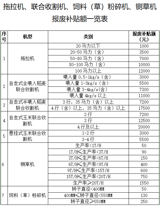 農(nóng)機(jī)報(bào)廢更新補(bǔ)貼由報(bào)廢部分補(bǔ)貼與更新部分補(bǔ)貼兩部分構(gòu)成,資金從農(nóng)機(jī)購(gòu)置補(bǔ)貼中列支。報(bào)廢部分補(bǔ)貼實(shí)行定額補(bǔ)貼,單臺(tái)農(nóng)機(jī)報(bào)廢補(bǔ)貼額原則上不超過(guò)2萬(wàn)元(詳見(jiàn)附表1)。更新部分補(bǔ)貼標(biāo)準(zhǔn)按農(nóng)機(jī)購(gòu)置補(bǔ)貼政策相關(guān)規(guī)定執(zhí)行。機(jī)主可以購(gòu)買(mǎi)與報(bào)廢種類和數(shù)量不同的農(nóng)業(yè)機(jī)械。