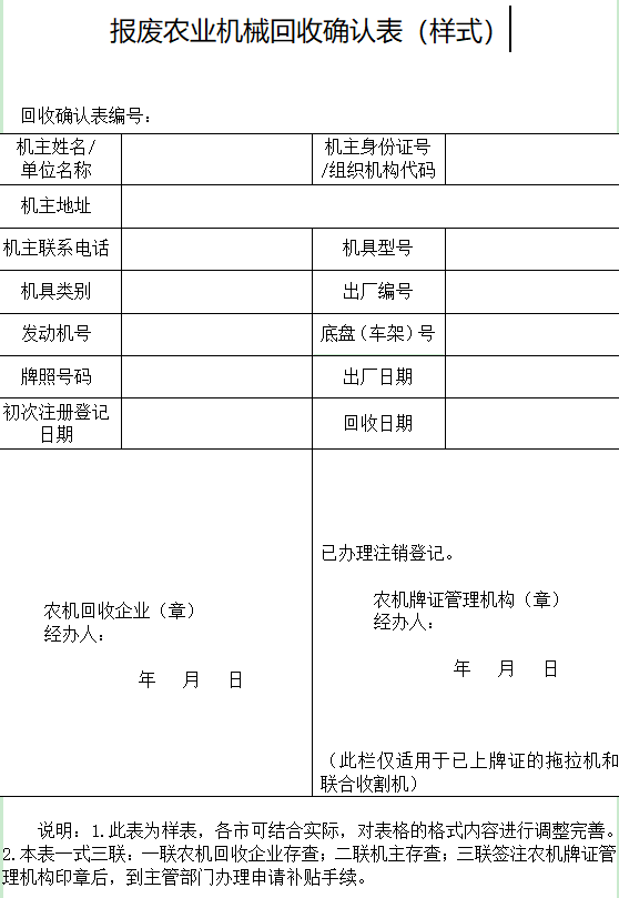 (一)報(bào)廢舊機(jī)。機(jī)主自愿將擬報(bào)廢的農(nóng)機(jī)交售給回收企業(yè)?;厥掌髽I(yè)應(yīng)當(dāng)核對(duì)機(jī)主和擬報(bào)廢的農(nóng)機(jī)信息,向機(jī)主出具《報(bào)廢農(nóng)業(yè)機(jī)械回收確認(rèn)表(樣式)》(見(jiàn)附表2,以下簡(jiǎn)稱《確認(rèn)表》),向當(dāng)?shù)剞r(nóng)業(yè)農(nóng)村部門(mén)提供機(jī)主和報(bào)廢農(nóng)機(jī)信息。報(bào)廢農(nóng)機(jī)殘值由回收企業(yè)與機(jī)主按照公平自愿原則,共同協(xié)商確定。